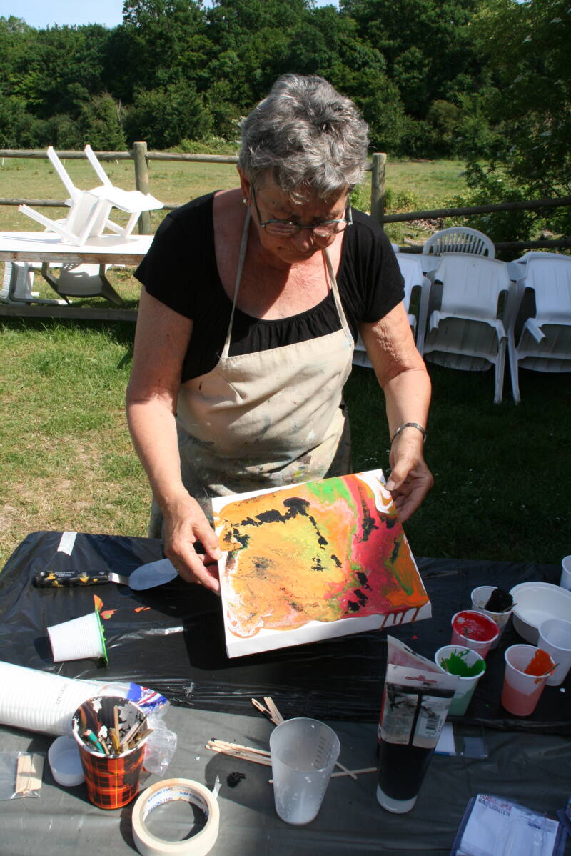 In de tweede week hebben we ook een paar dagen 'colorpouring' gedaan. Dat is een leuke techniek waarbij je niet perse hoeft te kunnen schilderen. Zowel door de beginners als de geoefende schilders haalden met deze techniek prachtige resultaten.
